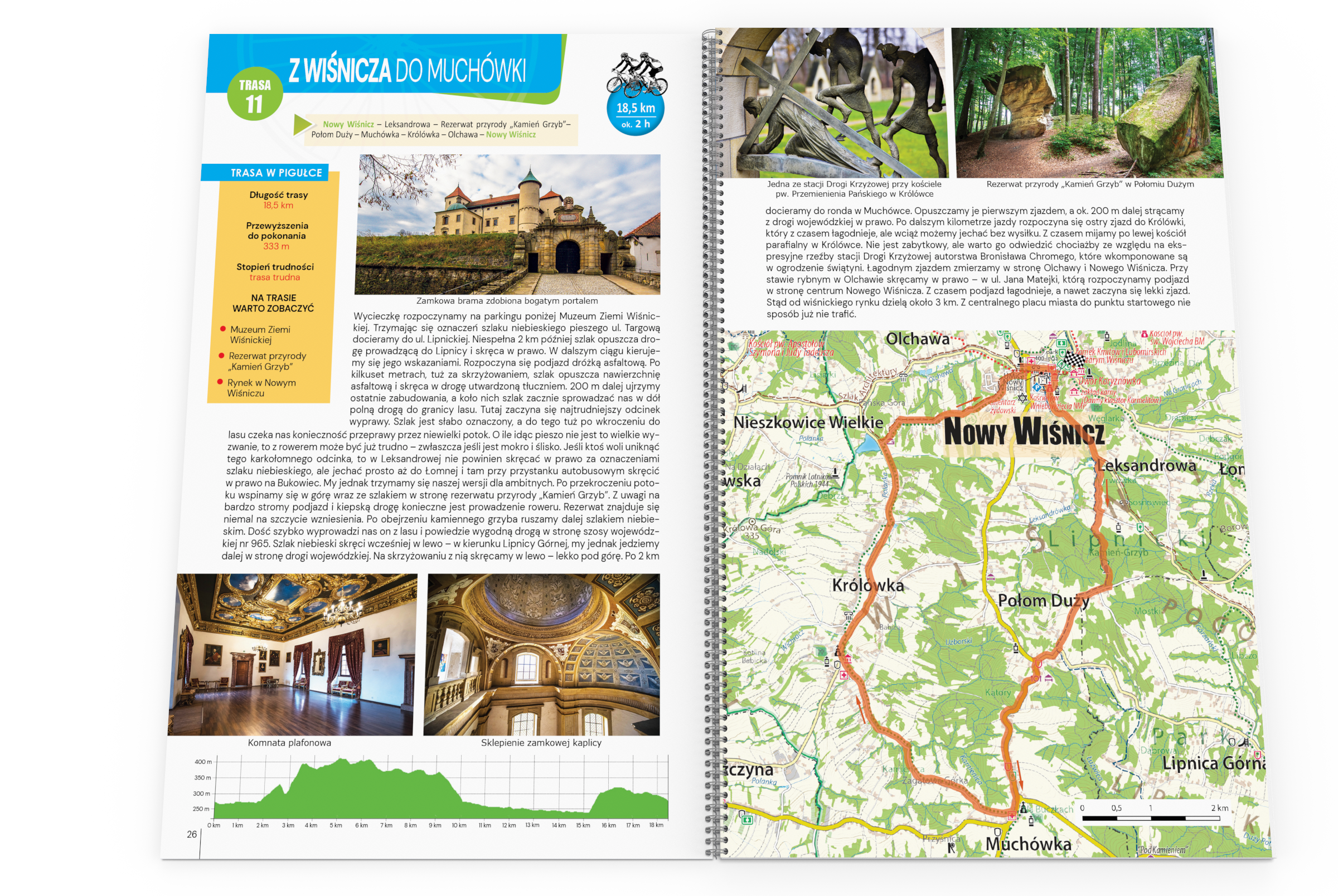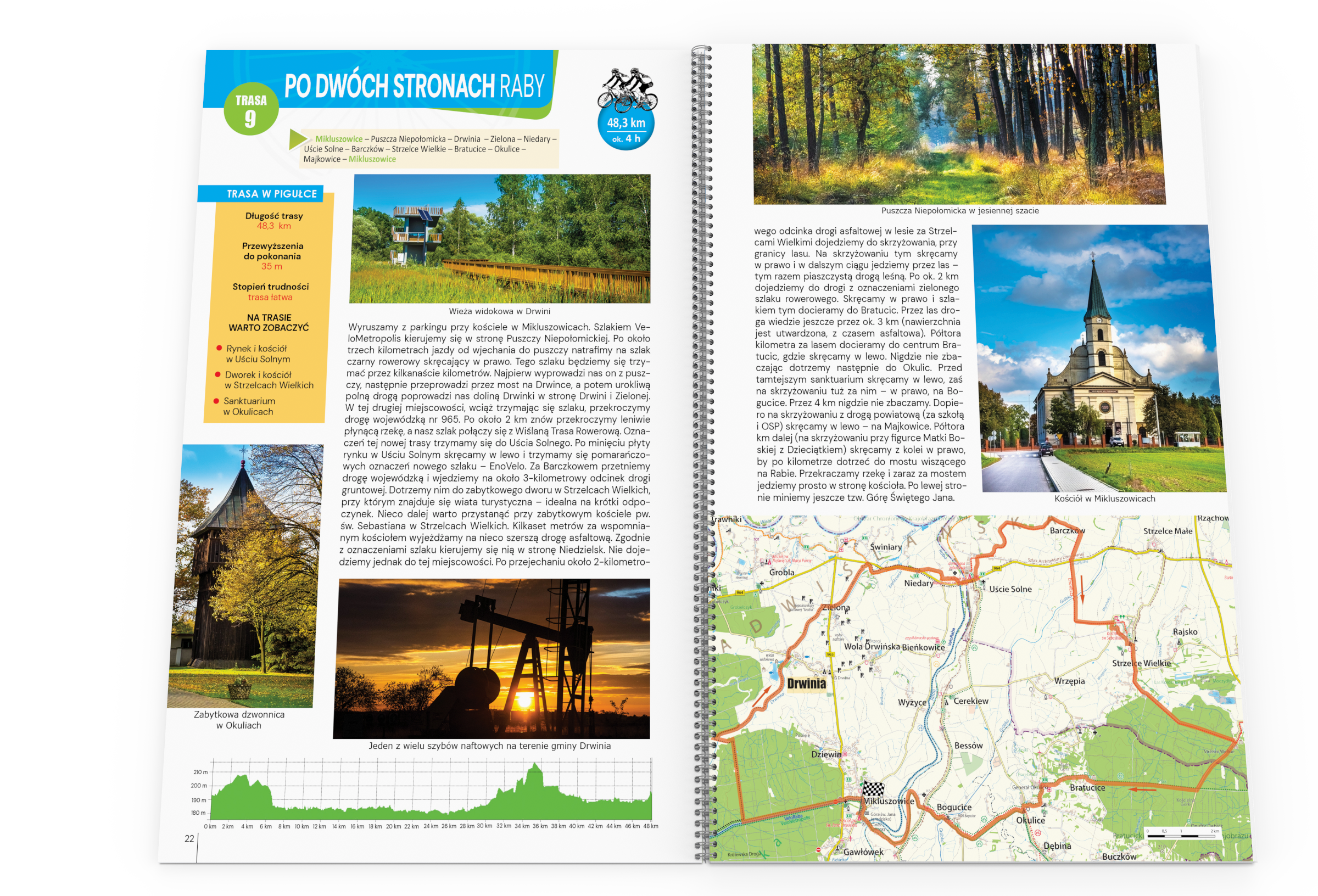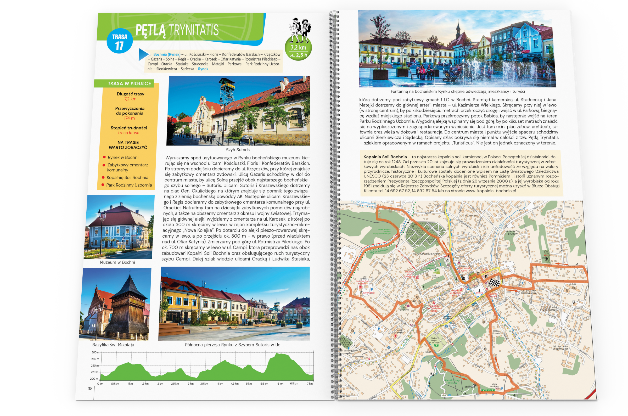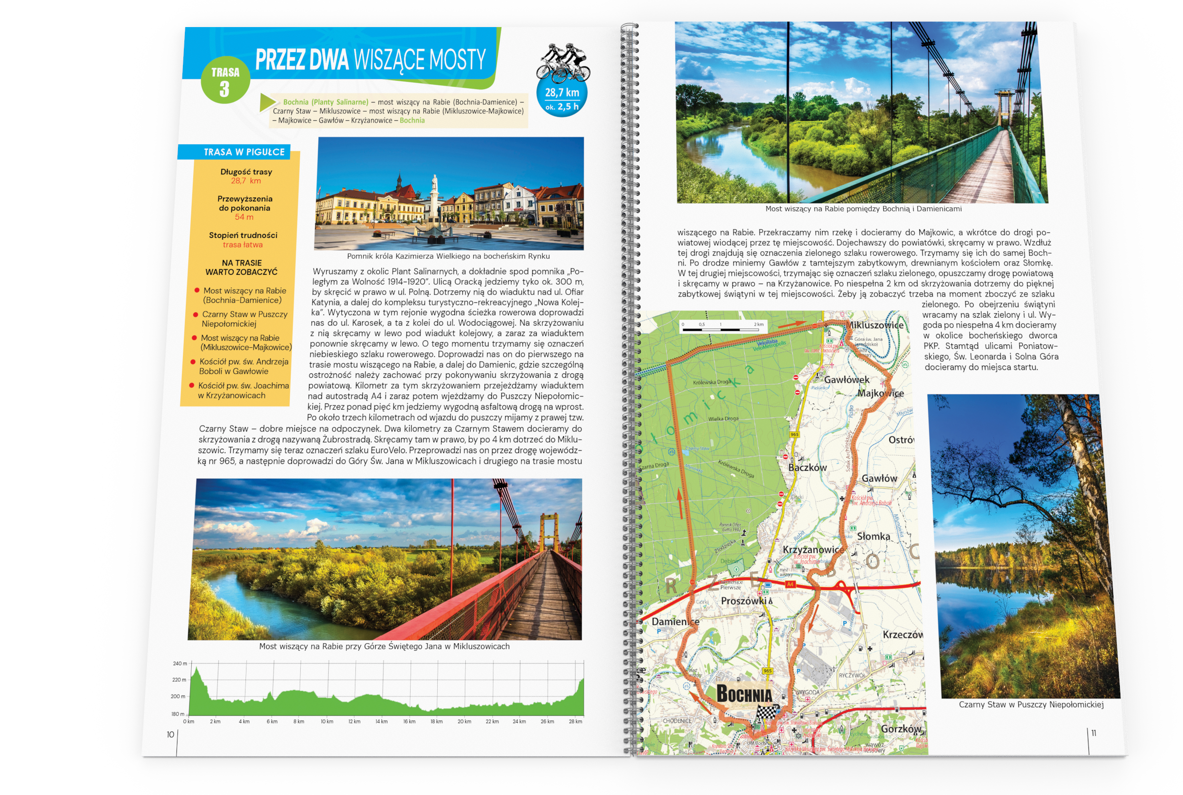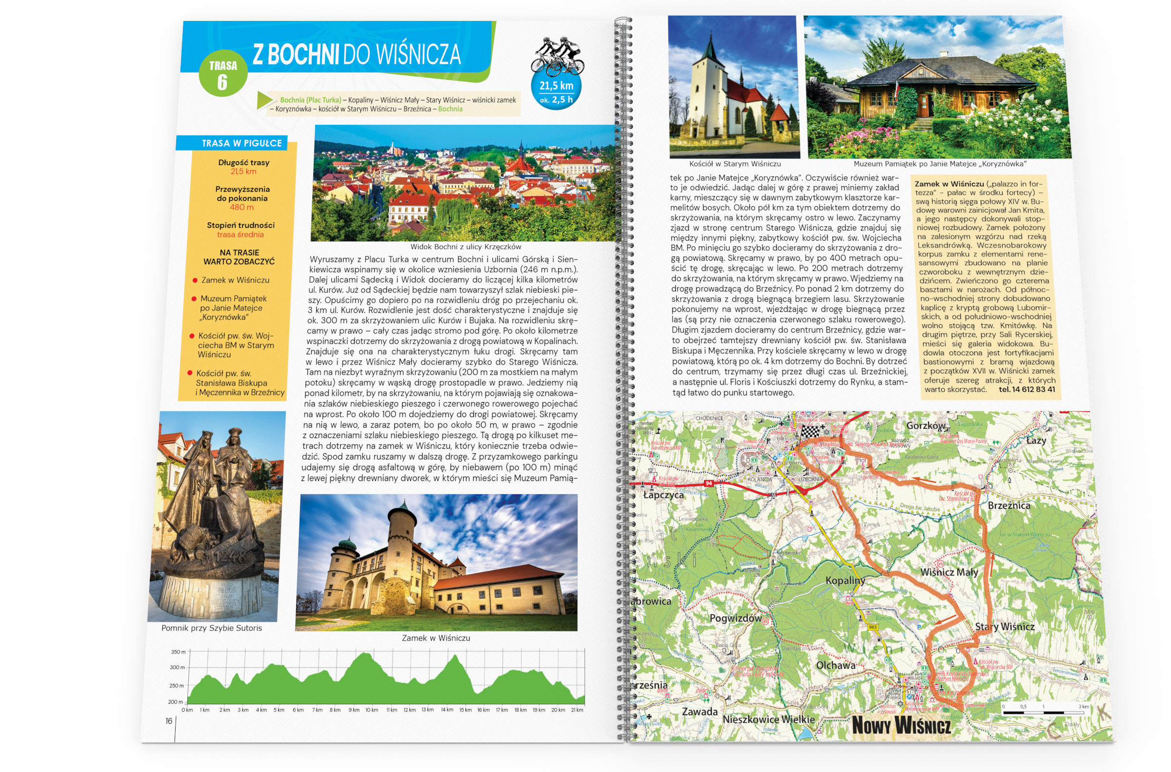 By łatwiej było wybrać propozycję dla siebie, każdą wycieczkę opatrzyliśmy krótką charakterystyką. Zawiera ona ogólny przebieg, długość, przewyższenia do pokonania oraz orientacyjny czas wyprawy. Umieściliśmy też mapki i profile wysokościowe wszystkich tras. Na tylnej, rozkładanej okładce przewodnika znajduje się poglądowa mapa powiatu bocheńskiego i okolic. Mamy nadzieję, że przewodnik pozwoli mieszkańcom Bocheńszczyzny jeszcze lepiej poznać jej uroki. Turystów natomiast zachęci, by częściej tu przyjeżdżali, zachwycać się pięknem lokalnych krajobrazów i zabytków.