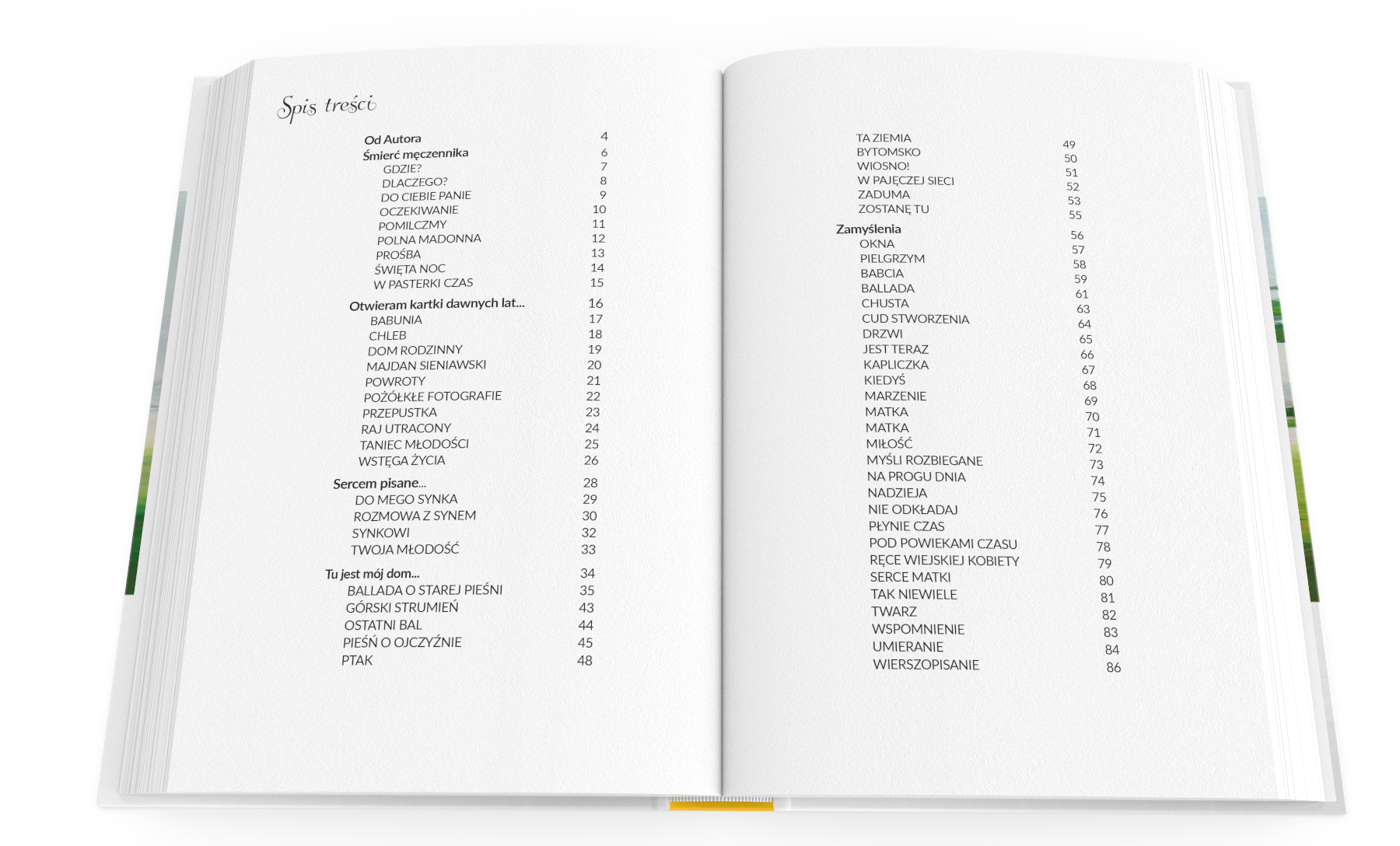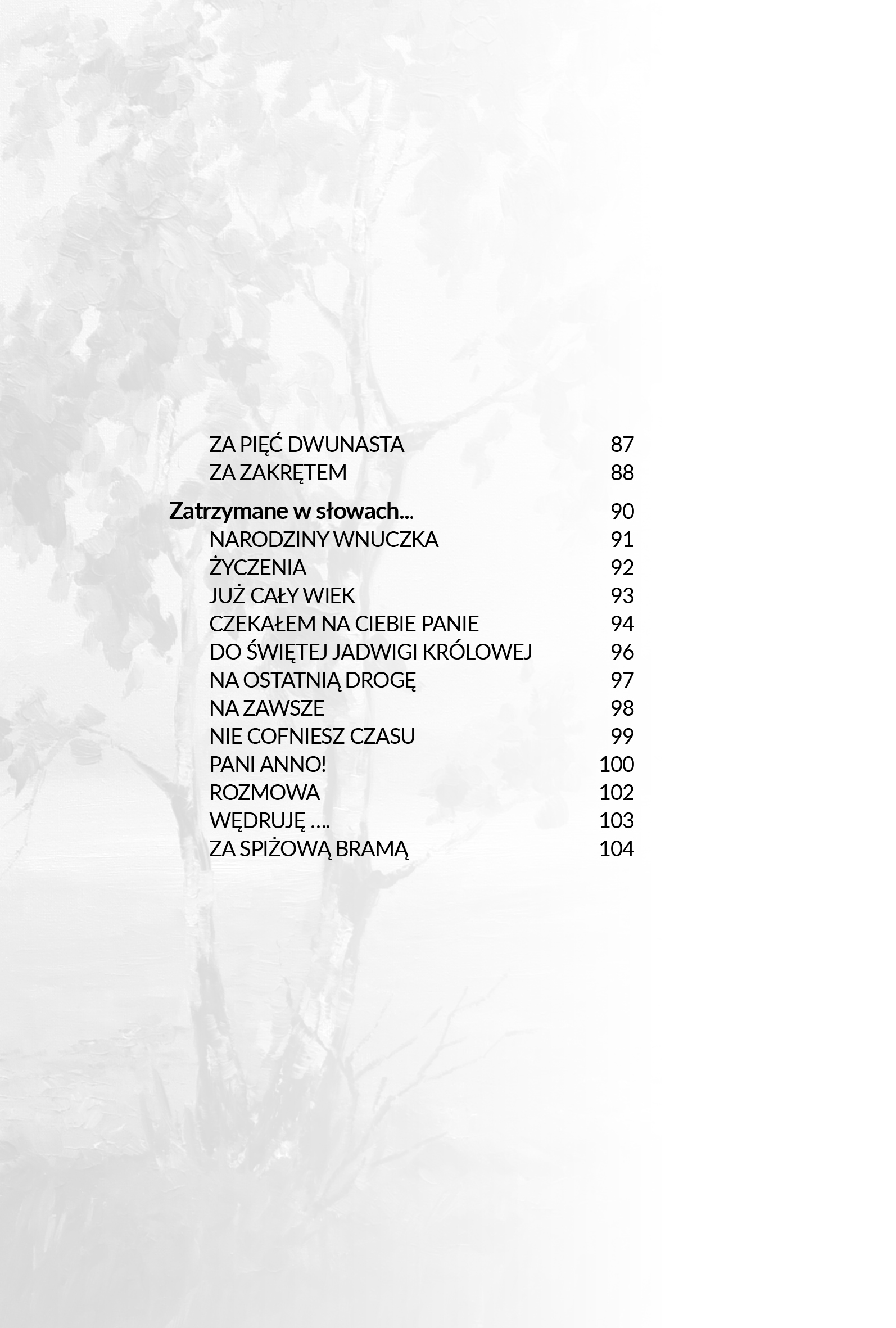 Wiersze dla porządku pogrupowane zostały w kilka rozdziałów, ale zawarte w nich motywy często się przenikają. Zachęcając do lektury, szczególnie polecam te najbardziej osobiste poetyckie wyznania. Nie wymienię żadnych tytułów – każdy odnajdzie najwłaściwsze dla siebie. Pozwolę sobie jedynie zacytować na koniec początkowy fragment wiersza poświęconego rodzinnej miejscowości Poetki, a zatytułowanego po prostu „Majdan Sieniawski”:
